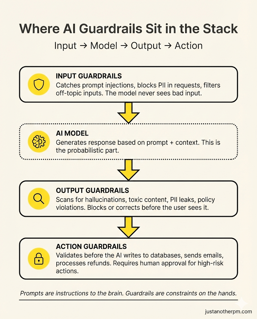 Think of it like a nightclub. The AI model is the DJ. It's creative, unpredictable, and occasionally plays something wildly inappropriate. The guardrails are the bouncers. They don't control what the DJ wants to play. They control what gets through the speakers and out the door.