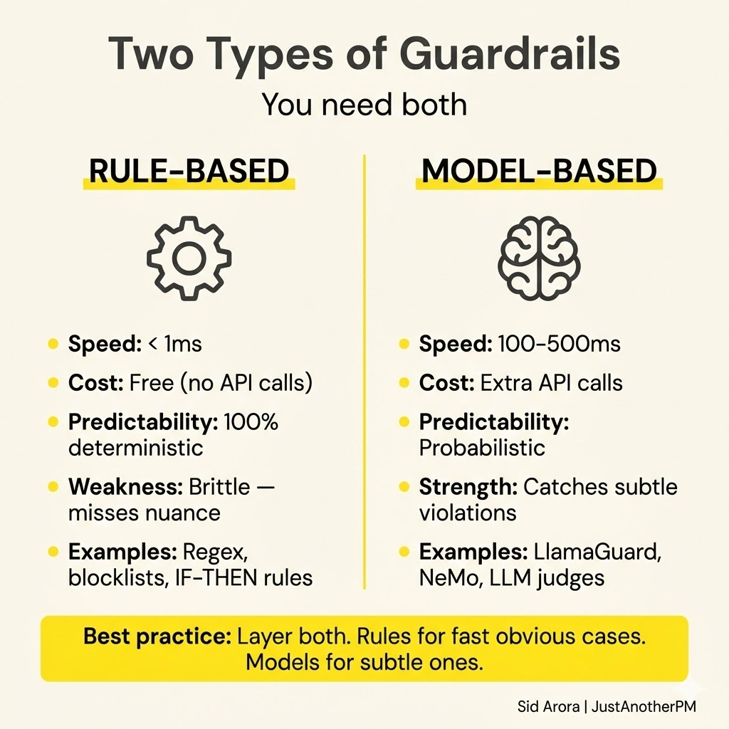 Start simple. Prompt-level instructions along with one or two rule-based checks cover most early-stage needs. Add model-based guardrails as your product scales.