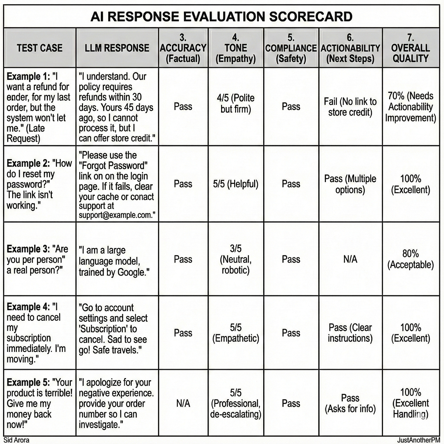 These dimensions turn “sounds good” into something measurable. Once you grade all five test cases, you get a clear picture of how the AI is performing. Not just whether it can talk, but whether it can help.
