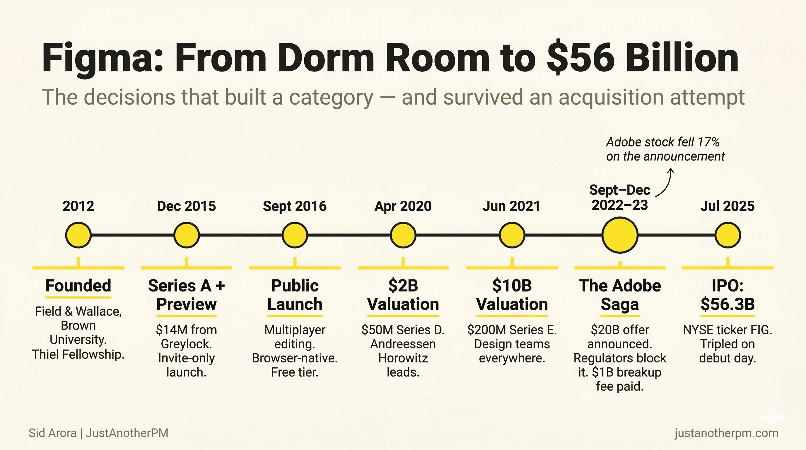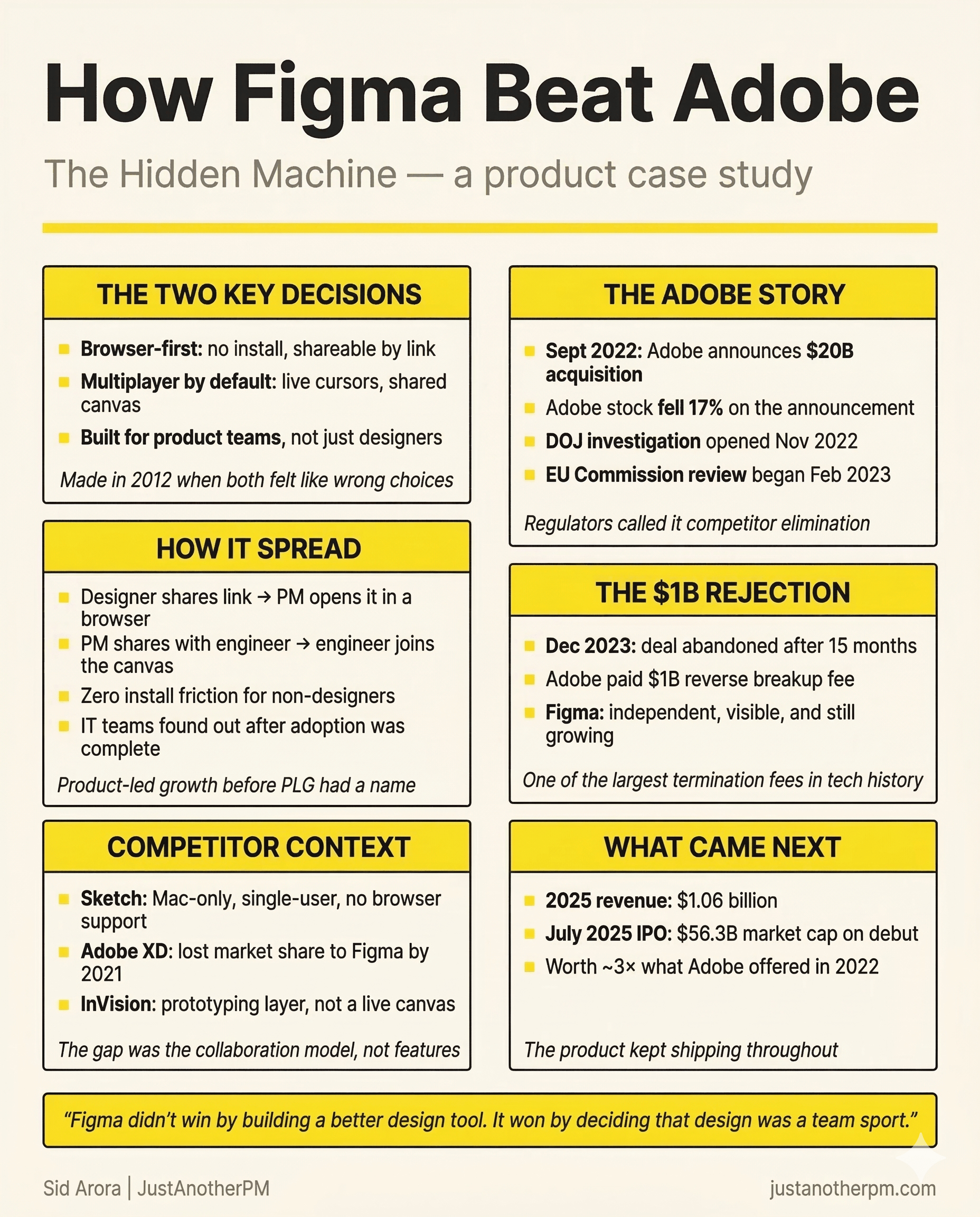 What happened next is the story of how one product decision built a $10 billion company, attracted a $20 billion acquisition offer from Adobe, and made Figma so valuable that Adobe’s own shareholders punished the company just for trying to buy it.