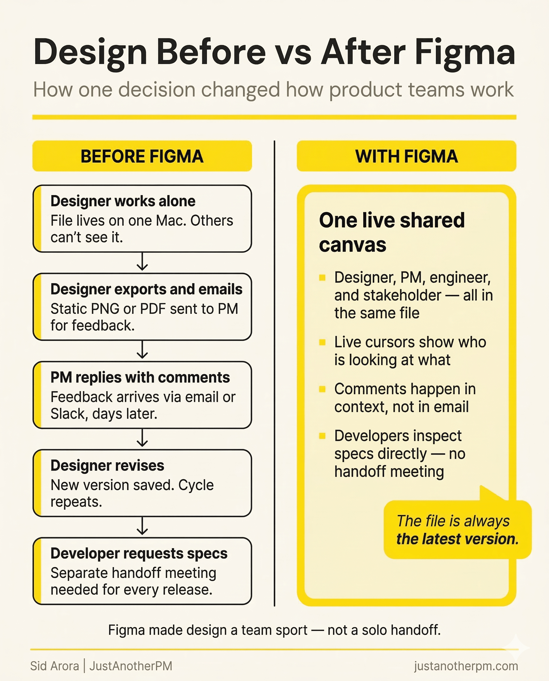 Before Figma, design files lived on one person’s laptop. The designer was the gatekeeper. A PM who wanted to check the latest mockup had to ask.