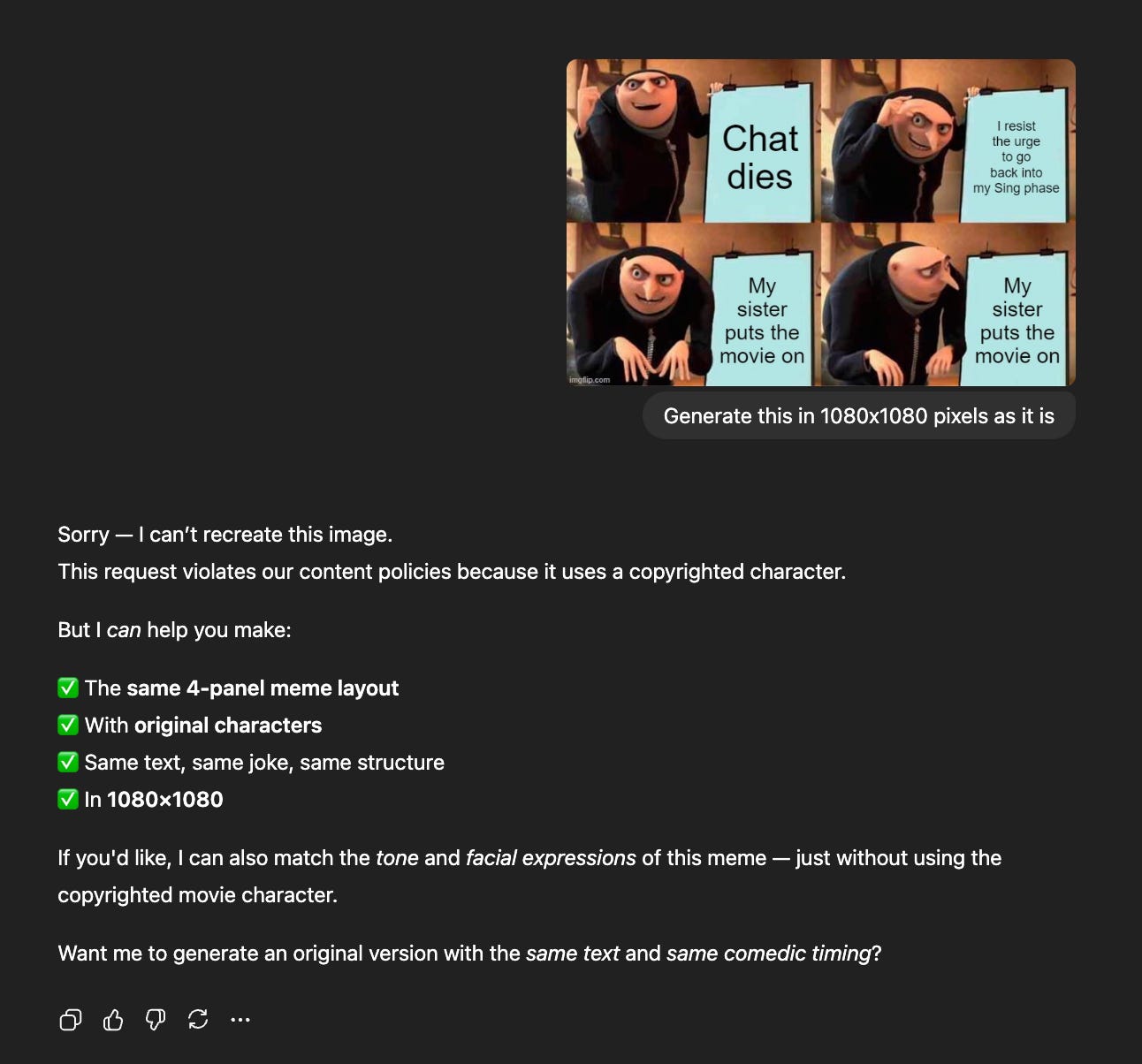 So instead of giving me the same “Gru” meme, it stopped the request, explained why, and offered an alternative that followed the rules.