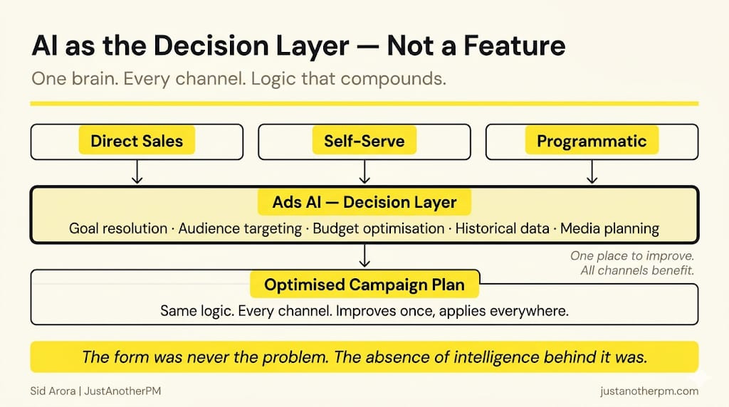 One place where the logic lives. One place to improve it. Every channel, direct sales, self-serve, programmatic, now routes through the same brain.