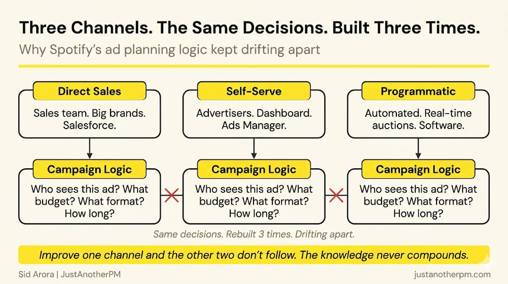 It’s the same decisions being re-implemented three times across three channels, drifting apart, and are impossible to keep consistent.