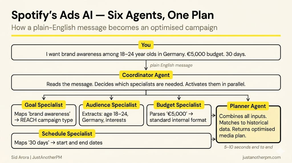 - Simple first, streaming later. The current version returns a complete plan once everything is ready. A more sophisticated version would stream results back in real time, you would see the audience spec appear, then the budget recommendation, then the full plan as each agent finishes. Spotify listed this as a planned improvement. Most teams start with the simpler version for good reason: it’s easier to build, easier to debug, and still delivers value.