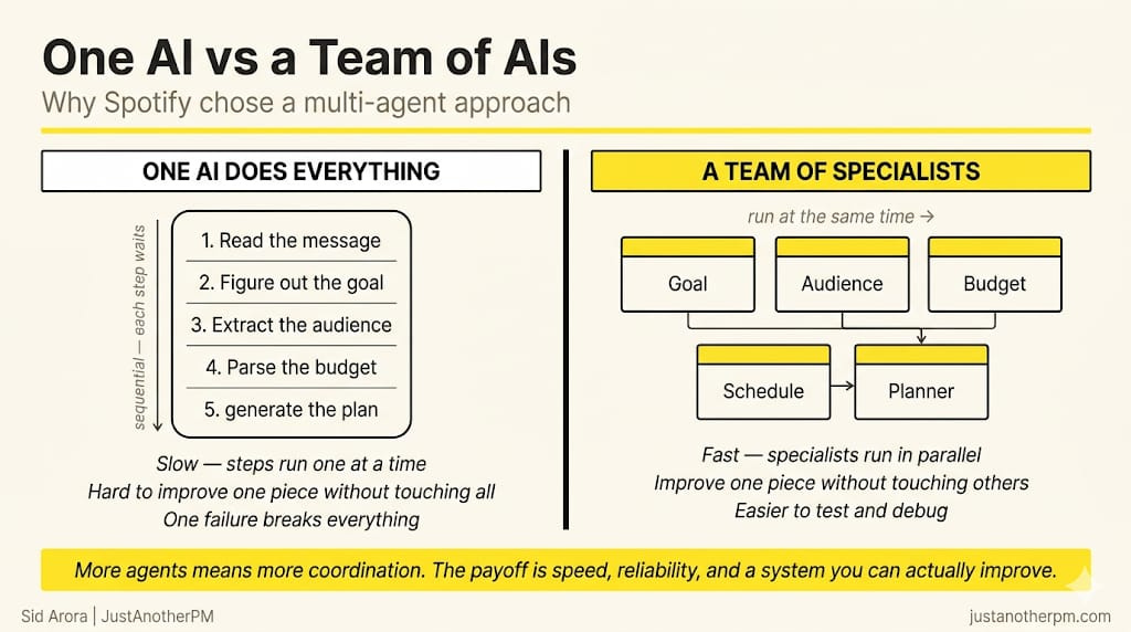 - Speed over completeness. Spotify chose to run the specialist agents in parallel, all at once, rather than sequentially. This makes the system faster but requires more coordination. The engineering tradeoff is complexity in exchange for a better user experience. Most AI product teams face this exact choice.