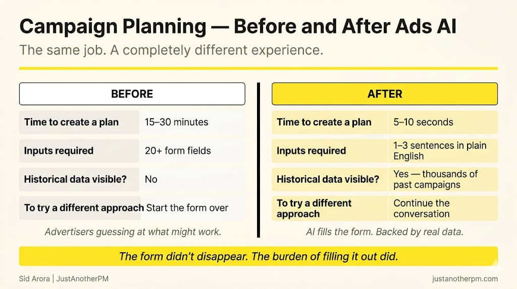 Campaign creation time dropped from 15–30 minutes to 5–10 seconds. The number of inputs required fell from 20 form fields to one to three sentences of plain English.
