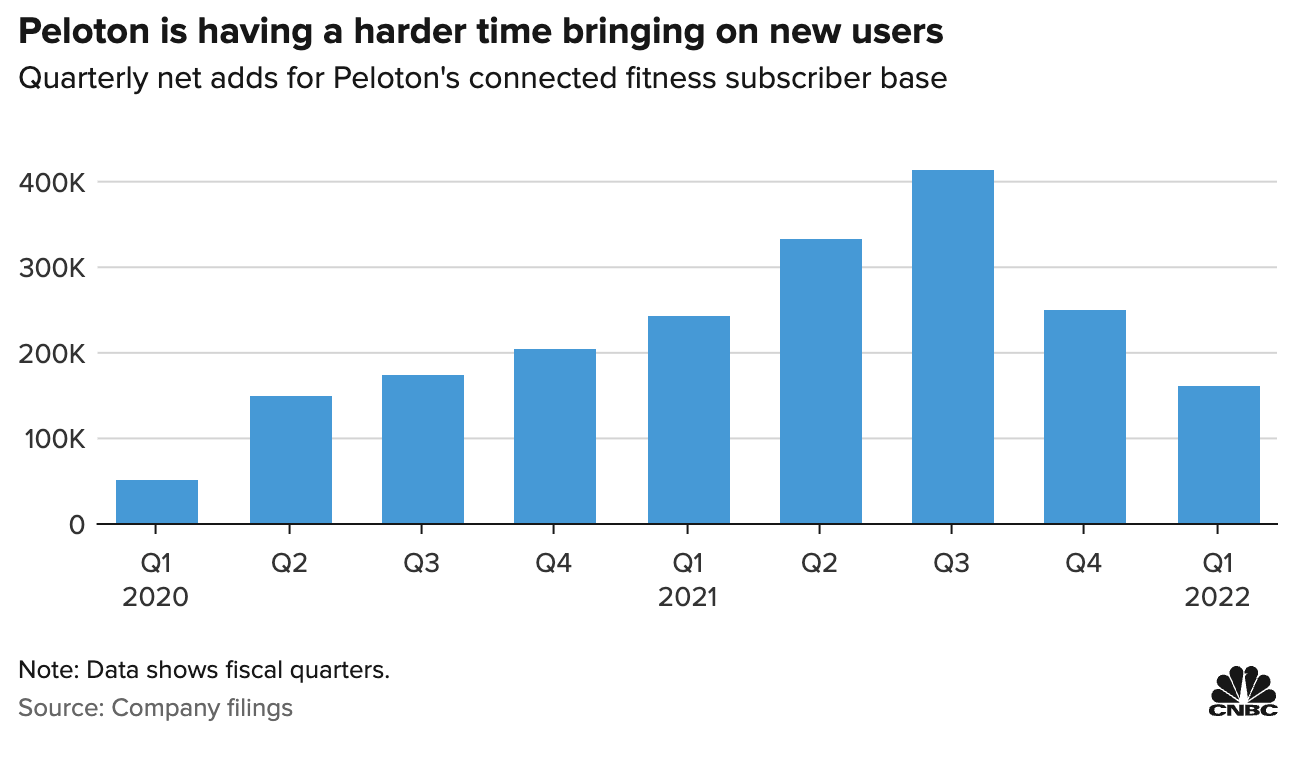 As vaccines rolled out and gyms reopened, Peloton's growth engine stalled. New subscriber additions slowed dramatically. The company had massively overbuilt inventory. In January 2022, CNBC reported that Peloton had temporarily paused production of its bikes and treadmills because demand had evaporated, leaving a glut of unsold hardware.