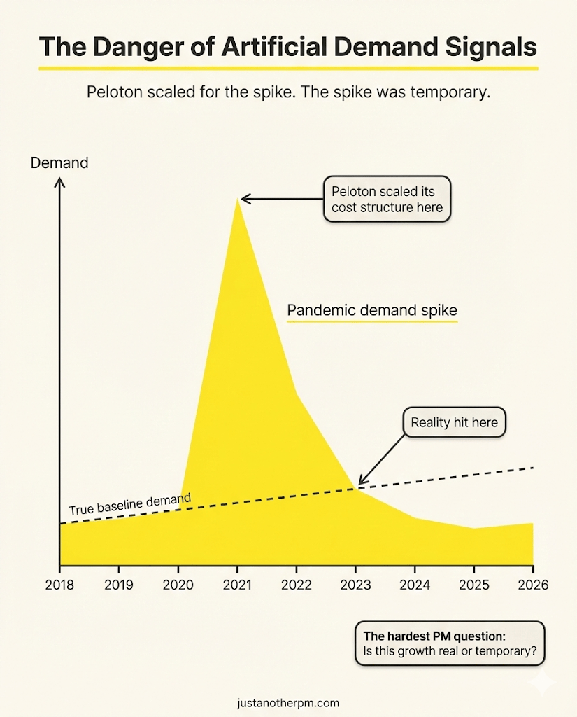The deeper lesson is about how product teams respond to artificial demand signals. When COVID hit, Peloton's metrics went vertical. Everything said "scale." But the right move — the one that's nearly impossible to make when the board is euphoric and the stock is soaring — was to ask: how much of this demand will survive the return to normal?