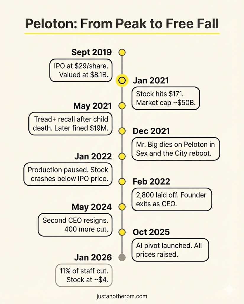 Two weeks ago, on January 30, 2026, Peloton cut 11% of its remaining workforce. It was the fourth major layoff in less than four years. Most of the cuts hit engineers, the same teams building the AI features Peloton launched just three months earlier as its comeback strategy.