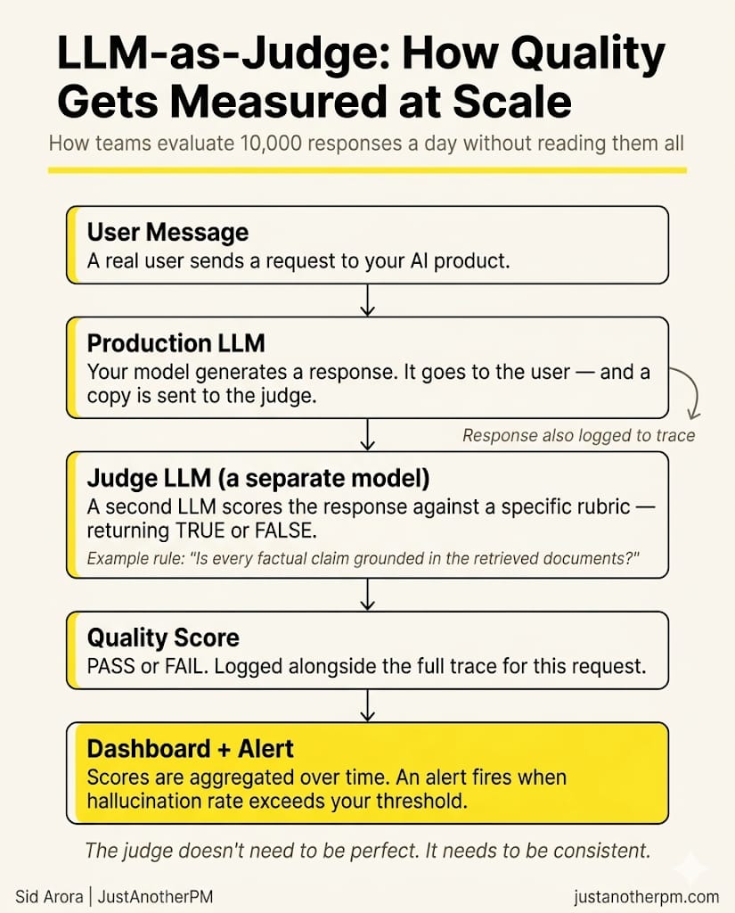 Here is how it works. For every response your system produces, a second LLM (which is the judge) scores it against a specific rule. The rule is always a TRUE or FALSE question: